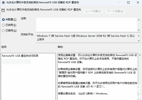 4、双击允许此计算机中受支持的其他 RemoteFX USB 设备的 RDP 重定向,并确保将其设置为【已启用】或【未配置】。