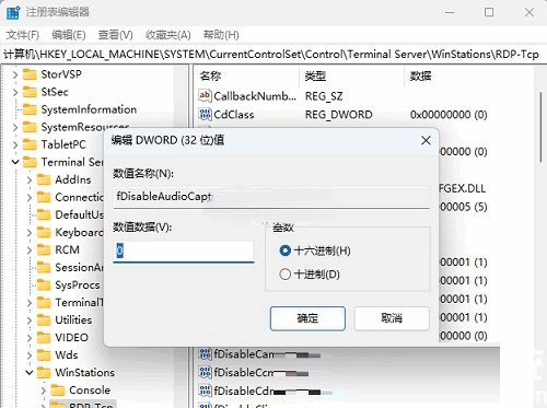 3、在右侧窗口中,双击【fDisableAudioCapture】并将值设置为【0】,然后点击【确定】。