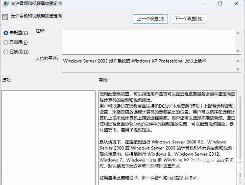 4、在右侧窗口中,分别双击【允许音频和视频播放重定向】和【允许音频录制重定向】,确保将它们设置为【已启用】或【未配置】。