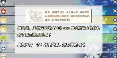 从4.7开始,好友列表上限由60改为100名。打住先别急(列表活跃不到一半我需要这个干啥),更何况以正常玩家的游戏体验,结识100位志同道合的好友根本不现实。那么在这种情况之下,做一个看起来没啥意义的改动,目的是什么?