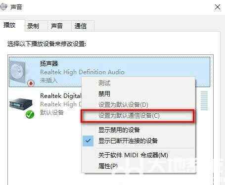 2、选择默认的设备作为默认通信设备,单击右键点击“属性”;