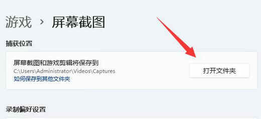 截屏是大家操作电脑时常用的一项操作,但是有的win11用户截完屏之后不知道要去哪里找图片,那么win11截屏的图片保存在哪里呢?如果大家用的是系统自带的截屏工具,就可以打开游戏设置面板,点击屏幕截图,然后在捕获位置右下方可以看到“打开文件夹”的按钮,通过这里就能打开截屏图片保存位置了。