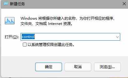 2、点击左上角“文件”,并选择“运行新任务”,输入“control”回车确定,进入控制面板