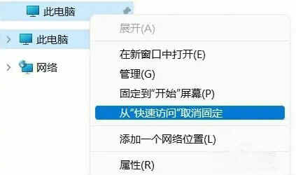 2、之后,我们在快速访问中找到此电脑右键选择从快速访问取消,如图所示: