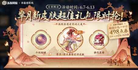 6月7日~13日,【光影不熄超值皮肤礼包】抢先上架,内含“芈月-浮光幕影”史诗限定皮肤、皮肤同款主题个性按键及静态表情三款道具,礼包仅售498点券~