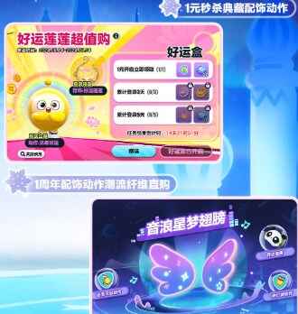 充值1元即可开启好运盒获得动作<见者好运>,累计登录5天即可解锁典藏配饰<好运莲莲>!