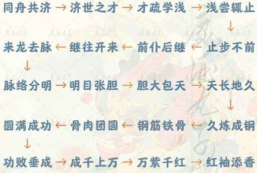 同舟共济→济世之才→才疏学浅→浅尝辄止→止步不前