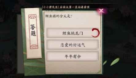 阴阳师鲤鱼旗的含义是什么?阴阳师手游在本次端午节期间更新了最新的答题活动内容,本次带来的是第九天也就是倒数第二天的问题答案,今日为各位小伙伴们带来了题目是“鲤鱼旗的含义是”,玩家们可以根据对游戏中的了解选择出正确的答案,就可以获得对应的奖励,本次小编要带来的就是倒数第二天的答案,有不知道的小伙伴们快来看看吧。