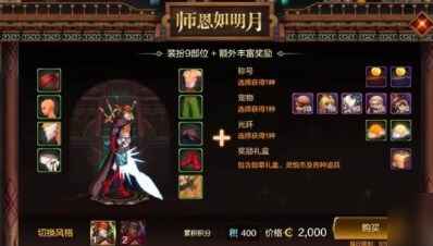 导师套礼包:这套礼包价值200RMB,里面包含了,一套高级时装、称号、宠物、光环,并且这里面还包含有黑钻特权和首冲奖励。