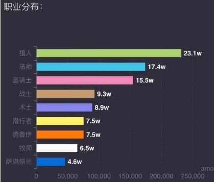 职业分布上猎人占据了最大的比重,总人数达到了23.1万人。而法爷和影帝则位列第二和第三。猎人向来都是人口基数最大的职业,法师也不例外,而圣骑士可能是因为WLK三系开花的缘故,所以很多人在压力测试也选了圣骑士来玩。另外几个职业分别如下:战士9.3万人、术士8.9万人、盗贼7.5万人、德鲁伊7.5万人、牧师6.5万人,萨满依旧垫底,只有4.6万人。