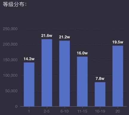 在本次压力测试中,有19.5万的玩家成功升级到了最高的20级。约占人口总数的20%。另外还有14.2万的朋友停留在1级,这意味着他们就是建个号拿下奖励就下线了。中间各个等级的玩家分布也算比较均匀,看来大家对这次压测还是有点兴趣但大部分人并没有选择好好玩,可能还是为了奖励或者上线随便玩一下聊聊天那样。