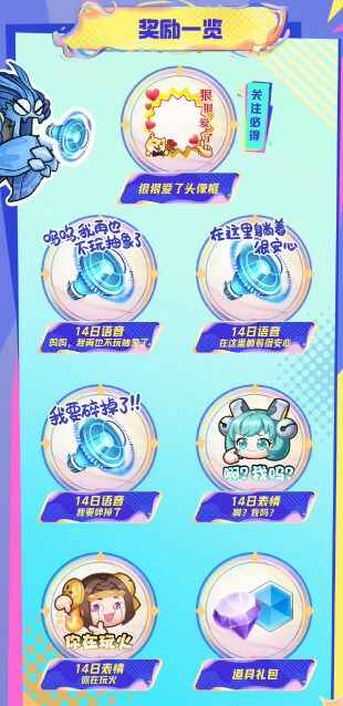 完成每日任务即有机会抽取14日语音“呜呜,我再也不玩抽象了”、14日语音“在这里躺着很安心”、14日语音“我要碎掉了”、14日表情“啊?我吗?”、14日表情“你在玩火”等精美礼品。