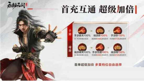 在公测首月,在任意端完成首次充值,即可在双端获得同等游戏货币,充值端还会额外赠送50%。
