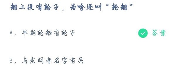 船运是我国重要的一种运输方式,轮船可以说是我们现在所见到的转载工具中最大,也是运输了最多的一个工具了。今天蚂蚁庄园小课堂问大家的是,船上没有轮子,为啥还叫“轮船”?一起来看看答案和介绍吧。