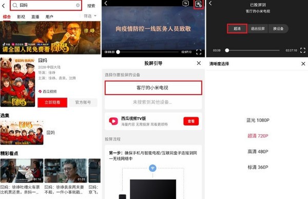 首先打开鲜时光,然后选择你想要观看的影视,接着点击“立即观看”。此时点击播放器及右上角的“投屏”按钮,然后在下方点击需要投屏的小米电视即可。如播放时出现明显延迟或频繁卡顿的情况,亦可在此处切换为较低级别的清晰度来解决。