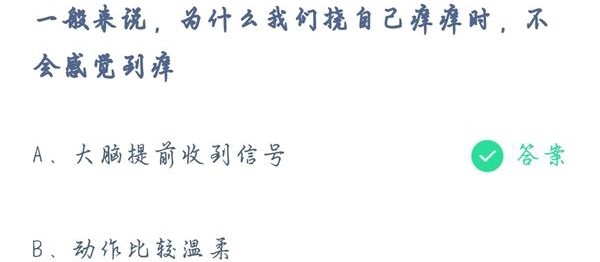 一般人在被别人挠的时候会觉得奇痒无比,而自己挠的时候就什么感觉都没有,相信很多人对这一现象都有困惑,今天蚂蚁庄园就是问大家,一般来说,为什么我们挠自己痒痒时,不会感觉到痒?一起来看看吧。
