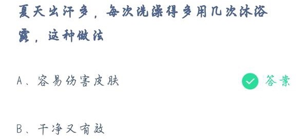 现代生活中,几乎每个人的家里都有沐浴露,是现代人必不可少的一样生活洗浴用品,大家平时洗澡的时候基本会使用沐浴露清洁肌肤。今天蚂蚁庄园就是问大家,夏天出汗多,每次洗澡得多用几次沐浴露,这种做法对吗?