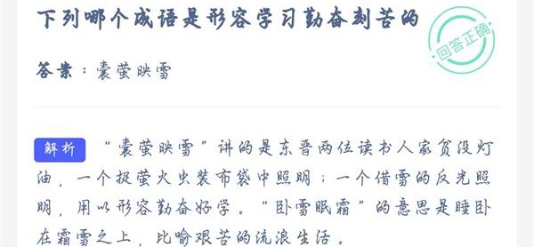 大家基本上都学过很多成语,其中形容学习非常刻苦的成语就有很多,比如凿壁偷光、悬梁刺股、废寝忘食、磨穿铁砚等等。今天蚂蚁庄园就是问大家,囊萤映雪和卧雪眠霜哪个成语是形容学习勤奋刻苦的?