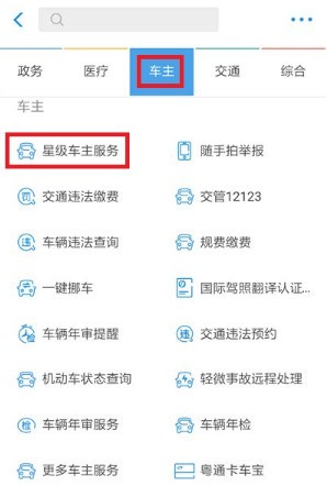 接下来系统会进行城市的定位,定位后下拉列表找到【车主】功能,并点击下方的【星级车主服务】。