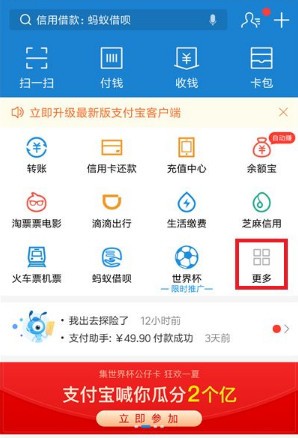 打开手机中的支付宝并登录账号,在首页中找到【更多】选项并点击。