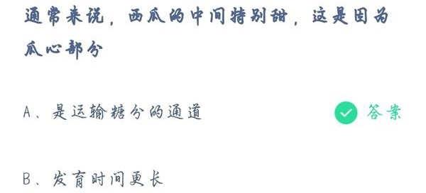 西瓜是夏季消暑解渴的一大佳品,爱吃西瓜的人都知道,一般西瓜中心那一块是最甜的,还没有籽,很受大家喜欢。今天蚂蚁庄园小课堂就是问大家,通常西瓜的中间特别甜,这是因为瓜心部分?一起来看看答案吧。