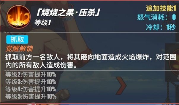 艾斯向前奔跑,抓住对方一名敌人,将其砸向地面,造成火焰爆炸,对小范围的的敌人都会有额外的造成伤害(技能的第2段是有抓取和位移的效果,在释放期间也是有霸气效果的)