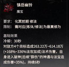 镇岳幽铃:对敌方4个目标造成伤害,自身进入破神(使后续群伤的神通和法宝造成伤害提高)