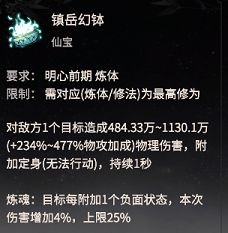 镇岳幻钵:对敌方1个目标造成伤害和定身,且目标身上的负面状态越多,本次伤害越高