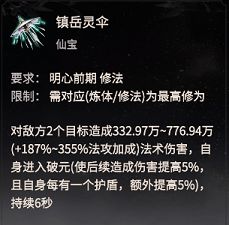 镇岳灵壶:对自己附加灵盾和明心(立即移除2个减益,在被定身或冰冻时也可使用),灵盾承伤不消耗真元
