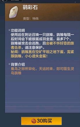 使用后在附近召唤一- 只鹞雉,鹞雉每隔一段时间会下蟾银蛋或羽金蛋,最多7个,鹞雉被攻击会逃跑,且会被不怀好意的旅者击杀,请注意保护。