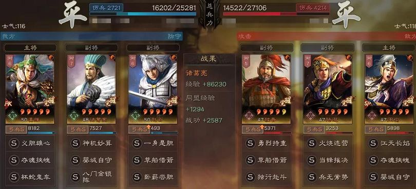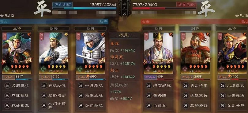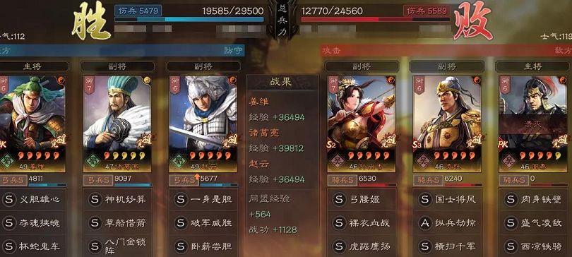 本队是实打实的双核并行,姜维赵云的输出能力相当,并且相当的稳定!姜维继续实行降维打击,【义胆】+【夺魂】的软控让敌军有劲难使,况且属性差带来的不仅是软控,增伤易伤也如诅咒般如影随形;