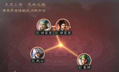 该阵容能获得“阵营加成”和“天水之战”16点武力的缘分加成。