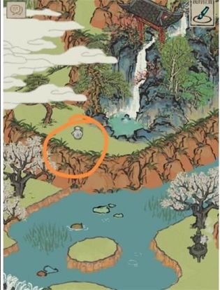 2、然后我们即可在鱼跃龙门的下方,最左上角,河对面,看见三秋酒,位置比较隐蔽,很多人把酒壶全部收集完了,才看到三秋酒。不用过去,直接点它就好了。