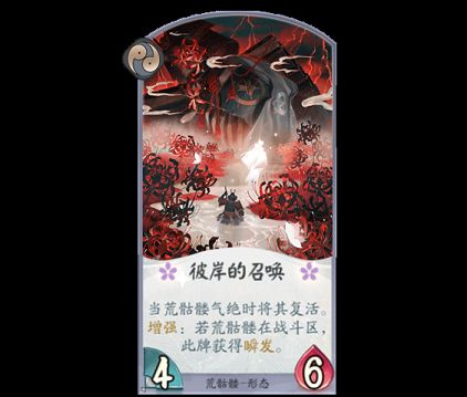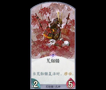 荒骷髅复活时移动的基础能力赋予了荒骷髅强大的站场能力。同时他也是一位擅长争夺战斗区的式神,当他在战斗区时,他的卡牌会拥有更强的效果。