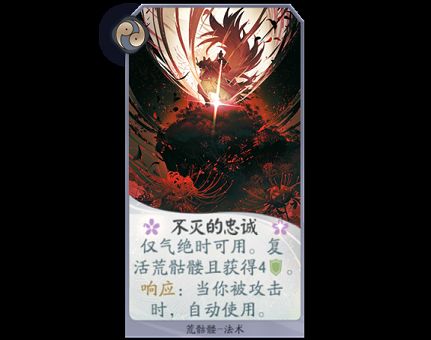 不灭的忠诚仅能在荒骷髅气绝时使用,复活并添加护盾增强了荒骷髅的站场能力。响应效果配合荒骷髅的基础能力,可以打出令敌方猝不及防的防御效果,保护己方牌手。