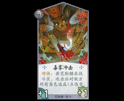 毒雾冲击在战斗区使用时能够在攻击后对敌方全体角色造成伤害,战斗牌的面板加成搭配增强效果,使荒骷髅可以打出两段伤害,压制敌方战斗区式神并削减准备区式神的血量。