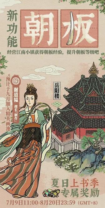 付费购买【象简】权益,提升朝板经验即可解锁专属奖励:全新侯级居民【谢道韫】、全新建筑【岳阳楼】。谢道韫预计将于9月加入精英画池;