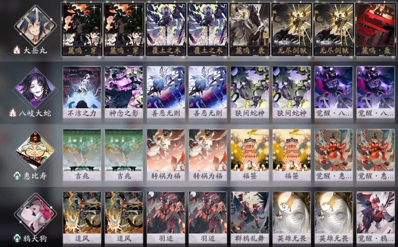 这是一套控制型的卡组。核心思路是运用惠比寿的福笹,让己方式神提前使用高勾玉的控制法术,对敌方关键式神进行点控,在中期打乱对方节奏。在三勾时使用觉醒▪八岐大蛇,配合狭间蛇神形态对敌方展开攻势。