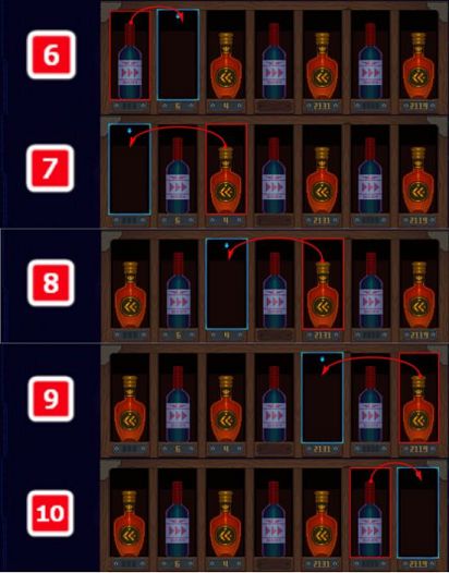 然后就要进行酒瓶换位的小游戏,需要我们把左边的蓝色酒瓶和右边的红色酒瓶的位置掉个个儿。整体是跳棋的玩法,即点击瓶子后,会跳入身边的空格,或者跳入隔一个瓶子的空格。解谜跳法如下图,以标注的数字顺序为步骤,依照箭头的指引移动瓶子。