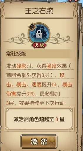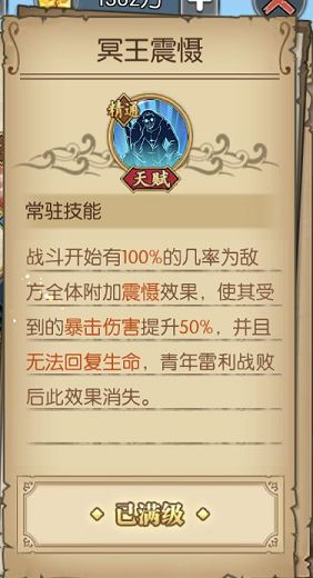 青年雷利主要天赋介绍:超然感知、冥慑、极诣剑术、王之右腕(简单来说,最主要是后面三个天赋,一个是震慑效果,一个是残影效果,一个就是触发了残影后会生成强攻效果,增加伤害。重点来说说残影,残影的触发概率加上终结技能的被动也才百分之五十,所以养了这个卡,在战斗中要触发残影效果还是比较看运气,如果运气差点,不触发残影,生存和伤害都会降低不少。然后说下冥慑这个天赋,施加震慑效果,让对方受到的暴击伤害增加百分之五十,并无法回复生命,这个天赋可以说是最实用的了,我不升星也带着也是因为这个天赋,给队伍里的输出多点伤害,百分之五十也不少了。