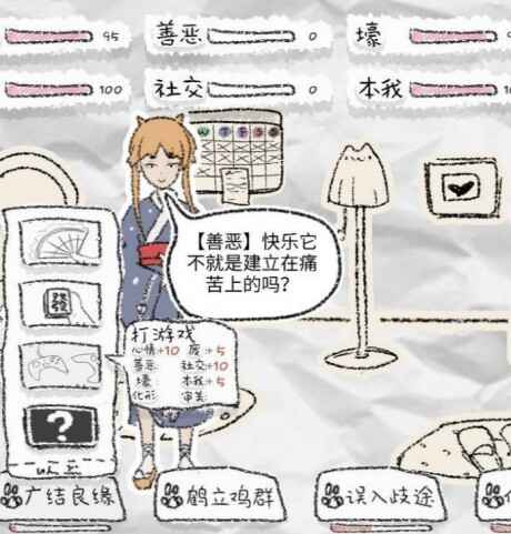 这个游戏很多选项减善恶减很多,所以刚开始不要刷善恶,用打游戏,参加培训和摇售货机把化形,心情,本我,壕,审美,社交加满(八九十即可)。在四百年以后开始刷善恶和废(善恶30废70),这样就能成仙啦。