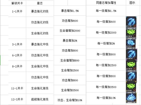 在挑战过程中,若关卡难度太高,可选择刷前面的关卡来获得属性加成,从而提升战力。每一个关卡掉落的意志都是随机的!