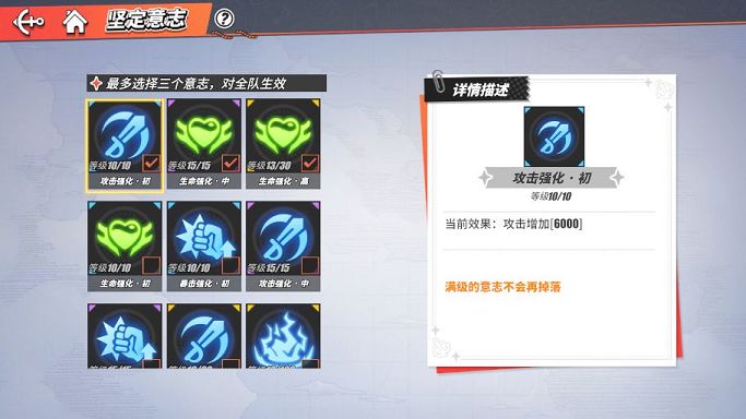 获得的意志加成可自由搭配,玩家每次挑战最多可装备三个,其效果通用于多个挑战玩法。