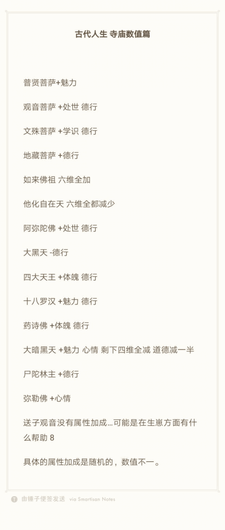 古代人生中,不同的寺庙有着不同的属性加成,下面一起来看看各个寺庙的属性加成吧。