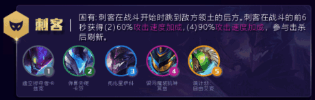 被动:战斗开始时,刺客会跳到敌方棋盘的最后,刺客在最开始的6秒会获得攻速加成
