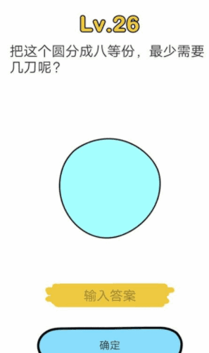 脑洞大师把这个圆分成八等份最少需要几刀呢是脑洞大师No.26关攻略,玩家们需要数出把圆形分成8份需要多少刀喔,那么脑洞大师把这个圆分成八等份最少需要几刀呢、脑洞大师第26关怎么过,大西洋软件园为大家带来介绍。