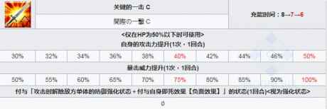 <仅在HP为50%以下时可使用>,自身的攻击力提升(1次・1回合),暴击威力提升(1次・1回合),付与「攻击时解除敌方单体的防御强化状态+付与自身即死效果【负面效果】」的状态(1回合)<视为强化状态>