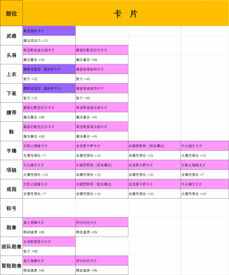 公会增益我们一定要保证智力和魔法暴击是满的,直接提升面板属性谁又不爱呢。最后就是魔力强化了,金币充足的情况下一定要把智力和命中点到15级,但10级以后消耗的金币太多,我们也可以点一些其他的属性,最终让自然魔力结晶达到3级,15点全属性强化,它不香么?卡片最终的选择我在下方整理出了表格,可以根据自己的实际情况来选择。卡片这个东西,怎么说呢,有的时候你有钱也买不到,太稀缺了。