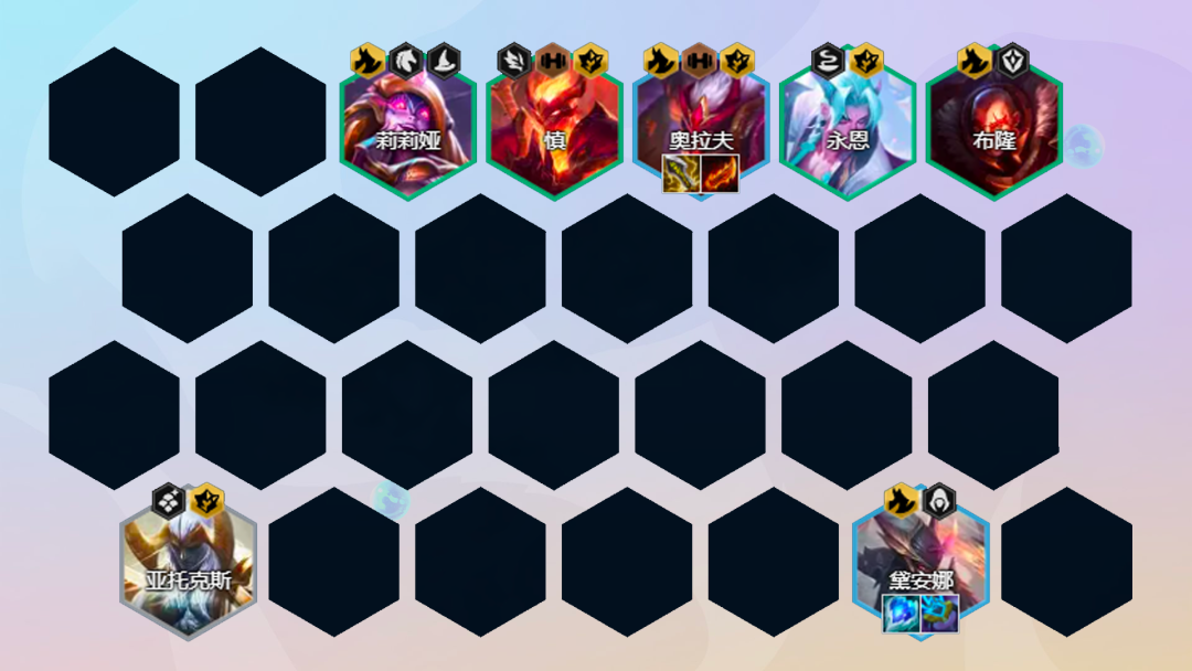 后期阵容:经济不好就5-2回合升8人口,阵容成型如上图所示,5阶段如果奥拉夫或者黛安娜没有三星是锁不住血的,升8之后一定要大搜一波,先搜一个三星出来稳血,5阶段选秀有奥拉夫、黛安娜、亚索可以拿,这个细节要注意,尤其是主C副C停牌的情况下,阵容三星之后即可吃分,有几率吃鸡。