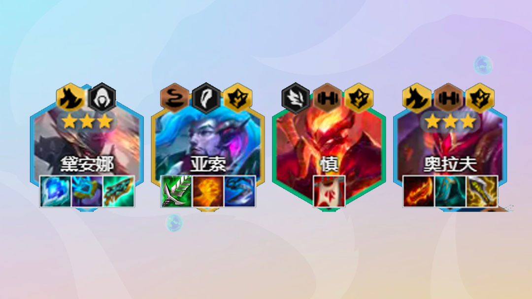 这套阵容算是一套冷门阵容,阵容物理和魔法伤害都有,上限很高再有狂刃战士纹章可以开6狂刃,或者是屠龙勇士纹章开6屠龙,一般来说大家都会卷当前版本主流阵容,如果没人拿奥拉夫和黛安娜成型之后很容易吃分。